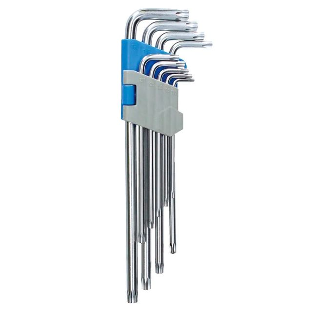 Conjunto ideal para trabajar con tornillos Torx, especialmente en mecánica, electrónica y bricolaje. Incluye tamaños: T10, T15, T20, T25, T27, T30, T40, T45, T50.