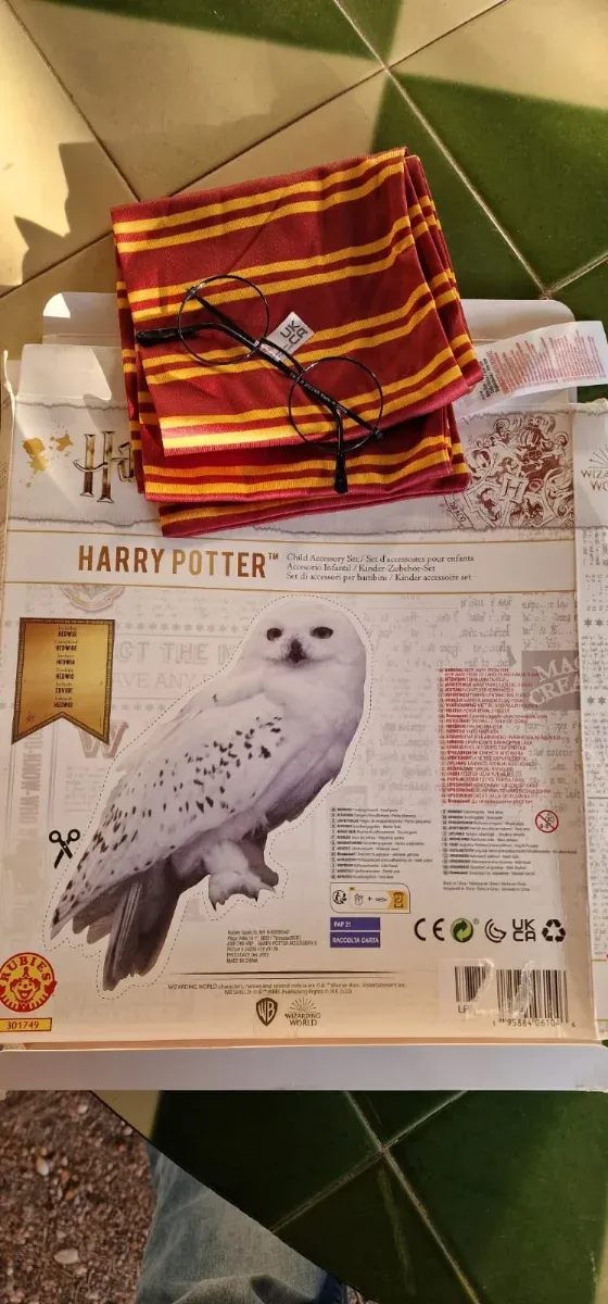 Set de accesorios de Harry Potter para niños. Incluye bufanda y gafas. - Bufanda a rayas rojas y doradas. - Gafas redondas de montura negra de aluminio.