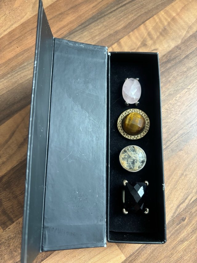Conjunto de cuatro anillos con diferentes diseños y piedras.
