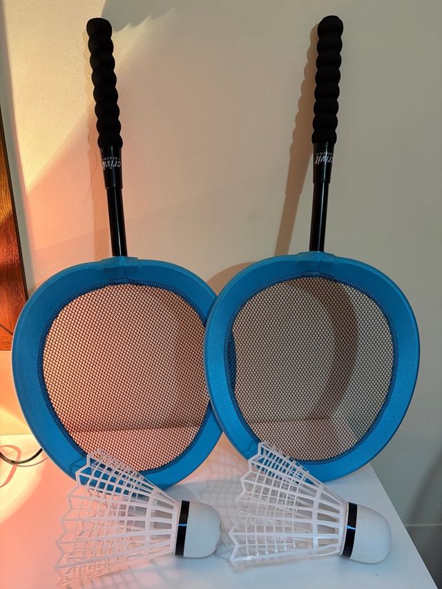 Set de bádminton XXL con dos raquetas y dos pelotas de badminton grandes. - Raquetas con mangos acolchados. - Red de malla en las raquetas.