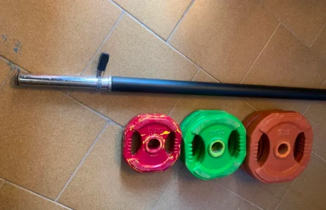 Incluye una barra y varios discos de diferentes pesos. Perfecto para hacer ejercicio en casa.