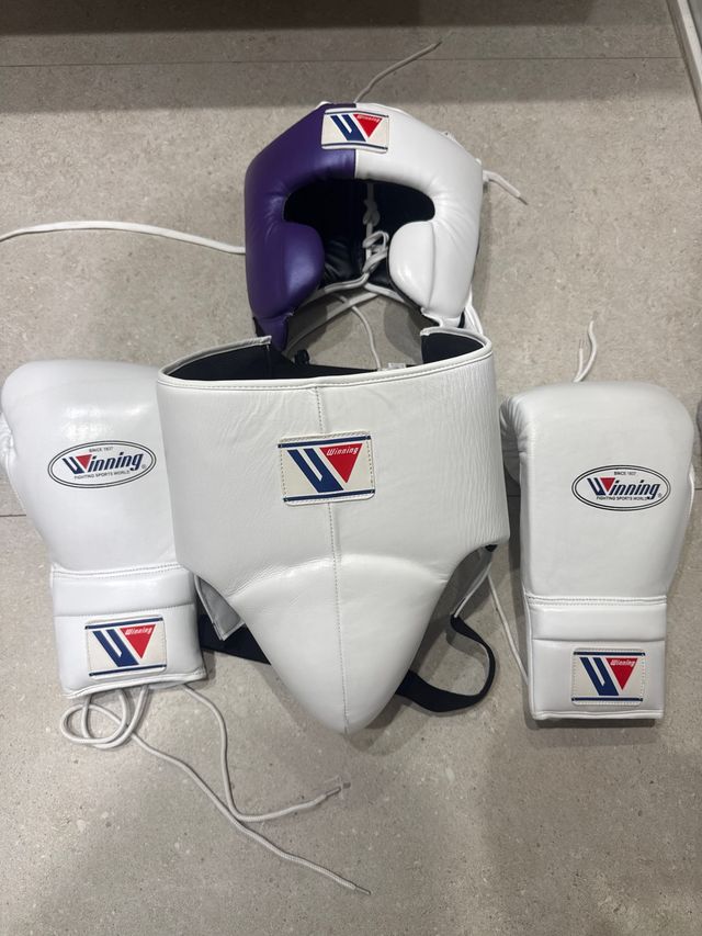 Set de equipo de boxeo de la marca Winning. - Casco protector de cabeza con detalles en morado y blanco. - coquilla - Par de guantes de boxeo blancos