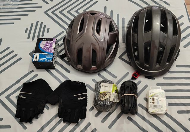 Detalles del productoVendo un set de ciclismo que incluye dos cascos de la marca Btwin, en color gris oscuro, con un diseño elegante y moderno; y dos guantes de ciclismo Btwin, negros, de apariencia resistente. También se incluyen dos cámaras de aire de 24" y dos cubiertas de 26". Todo en buen estado.