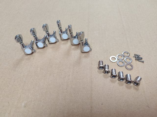 Detalles del productoSet de clavijas cromadas 6 en línea diestras para guitarra eléctrica. Incluye todo lo necesario para su instalación. Son nuevas, pero pueden tener algún pequeño arañazo debido al almacenaje. Nada importante