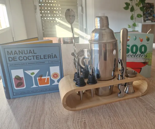 Detalles del productoSet completo de coctelería con base de madera.