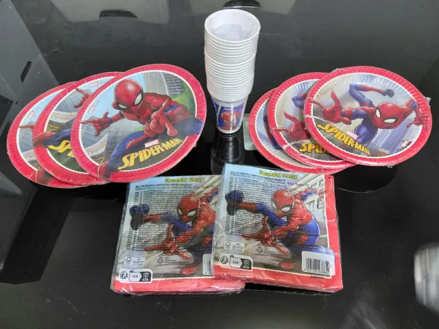 Detalles del productoSet de fiesta de cumpleaños con temática de Spiderman. Incluye platos, vasos y servilletas.