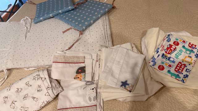 Conjunto de artículos para cuna de bebé, en muy buen estado o sin estrenar incluso: chichoneras, funda de nórdico y almohada, set de sàbanas, cubrecolchones....