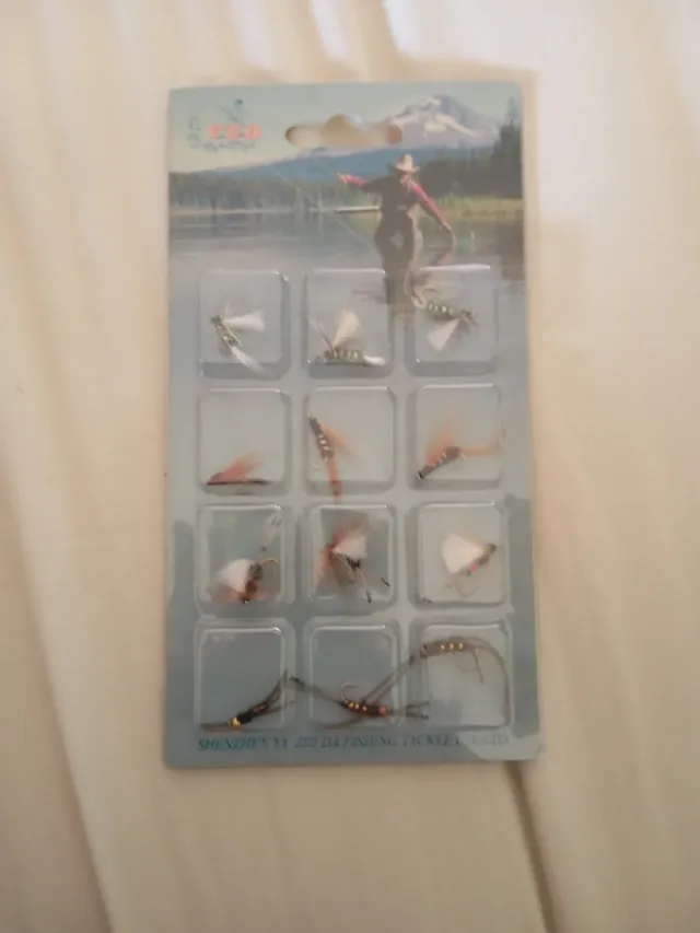Detalles del productoSet de 12 señuelos de pesca a mosca, ideales para la pesca deportiva.