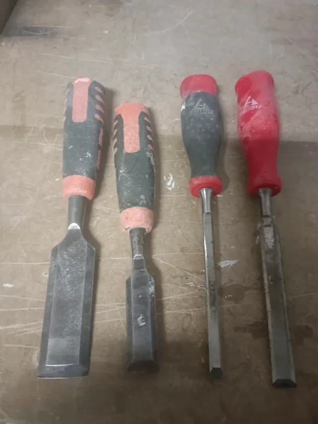 Set de cuatro formones de diferentes tamaños. Herramientas para carpintería o trabajos en madera. - Mangos ergonómicos de plástico y goma. - Hojas de metal afiladas.