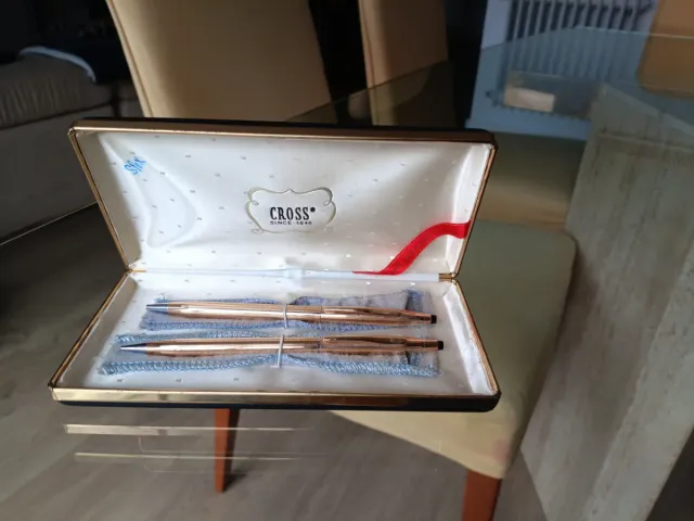 Elegante set de bolígrafo y Portaminas de la marca Cross, con un acabado en oro de 14 Kt. - Diseño clásico y sofisticado. - Incluye estuche original.