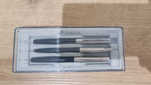 Set de dos bolígrafos y una pluma de la marca Parker. - Incluye dos bolígrafos y una pluma - Diseño elegante en color negro y plateado.
