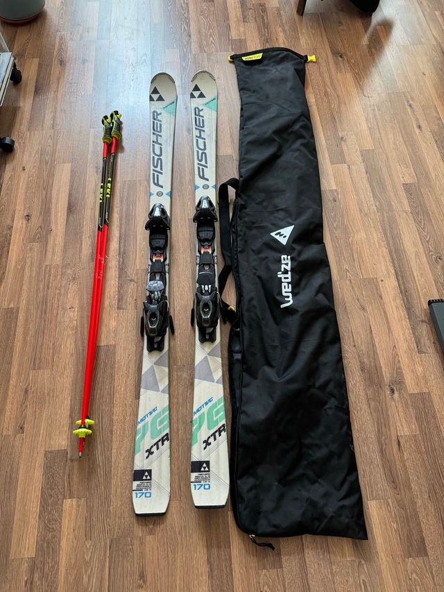 Detalles del productoSet de esquís Fischer completo, listo para la nieve. Incluye bastones y funda para su transporte.