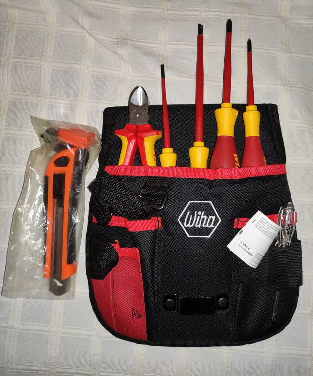 --Funda porta herramientas con diferentes compartimentos al que se le puede poner un cinturón. De tela fuerte y rígida.