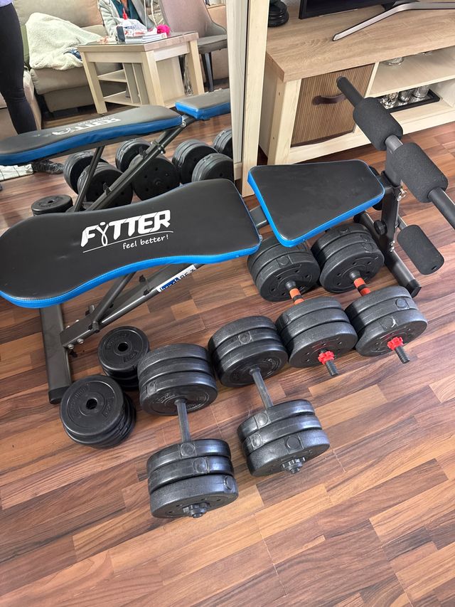 Detalles del producto🏋️♂️ Set de mancuernas ajustables y de 🎁banco de pesas + espejo 💪 Home Gym completo
