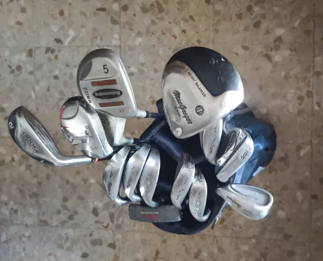 Detalles del productoConjunto de palos de golf variados para hombre, incluyendo un driver MacGregor DX y un híbrido Boomerang.