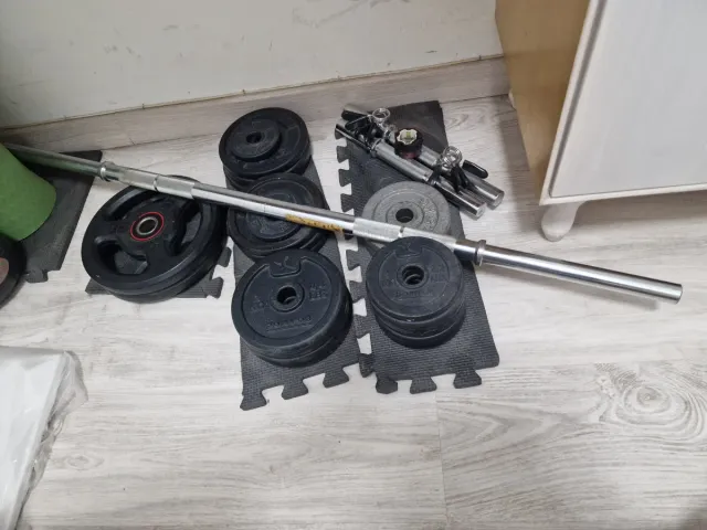 Detalles del productoSet de pesas con barra para entrenar en casa.