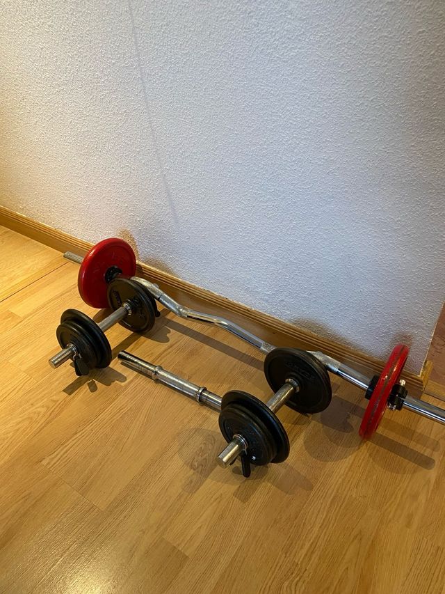 - 3 barra para mancuerna con 4 discos de 2kg y 6 discos de un kg.