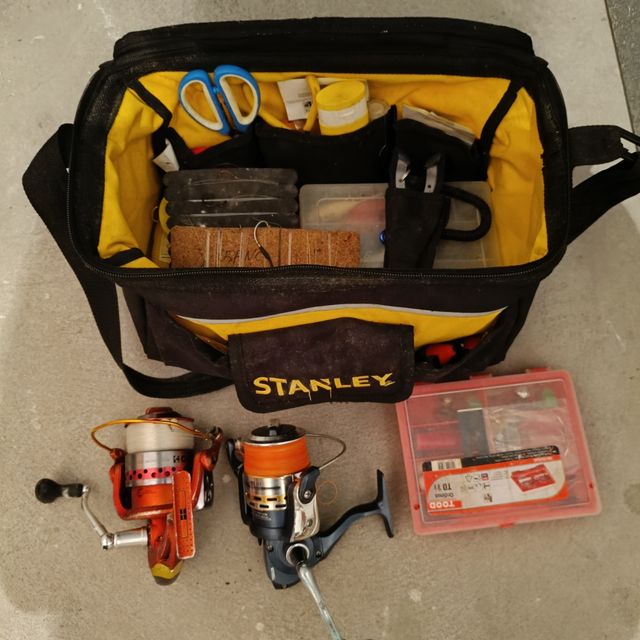 Conjunto de material de pesca que incluye dos carretes y un bolso organizador. - Dos carretes de pesca. - Bolso de herramientas Stanley.