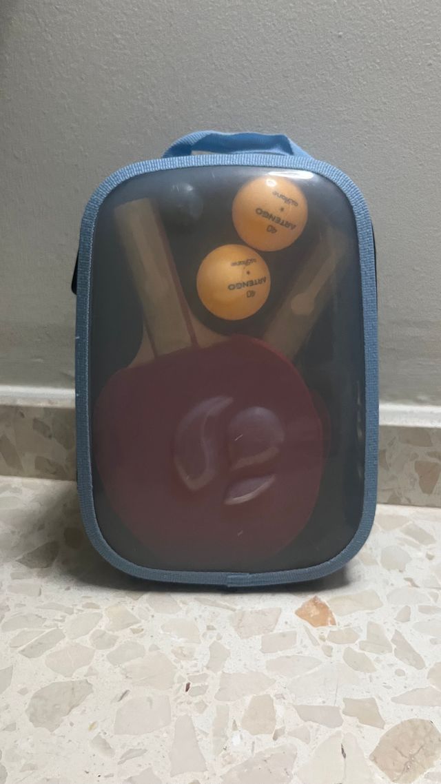 Set poste red de ping pong de Decathlon, la red es totalmente ajustable, además se añaden 2 pelotas y 2 palas, una de ellas está pintada.