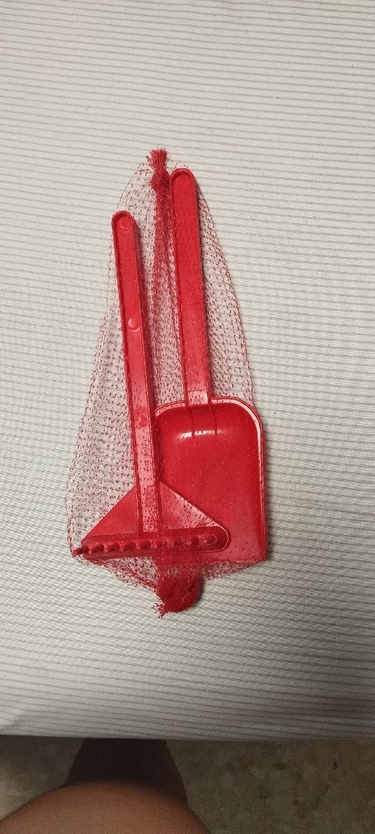Set de herramientas de plástico para jugar en la arena. - Pala roja. - Rastrillo rojo. - Incluye bolsa de malla.