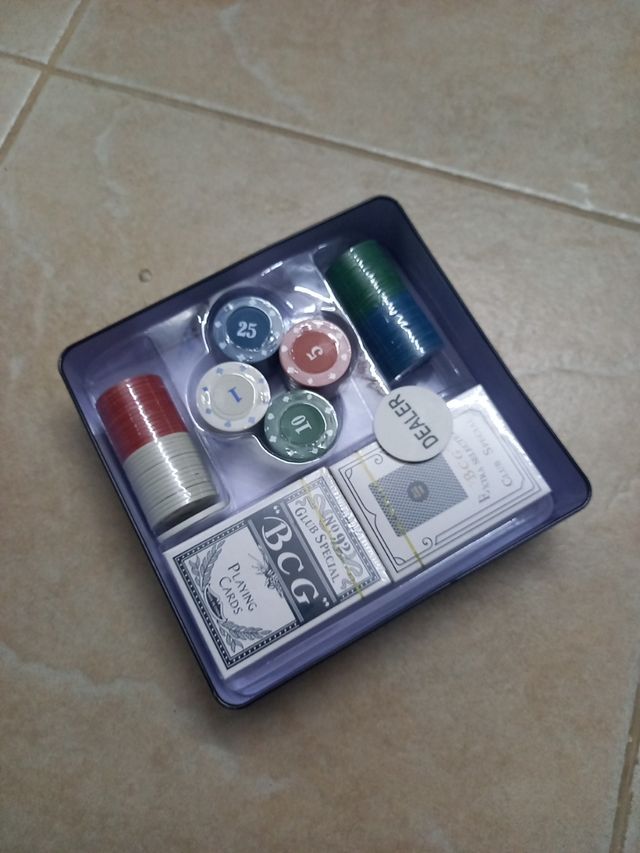 Set de póker completo con fichas de diferentes valores y cartas. - Fichas con valores 1, 5, 10, 25. - Incluye fichas de dealer. - Cartas BCG Club Special.