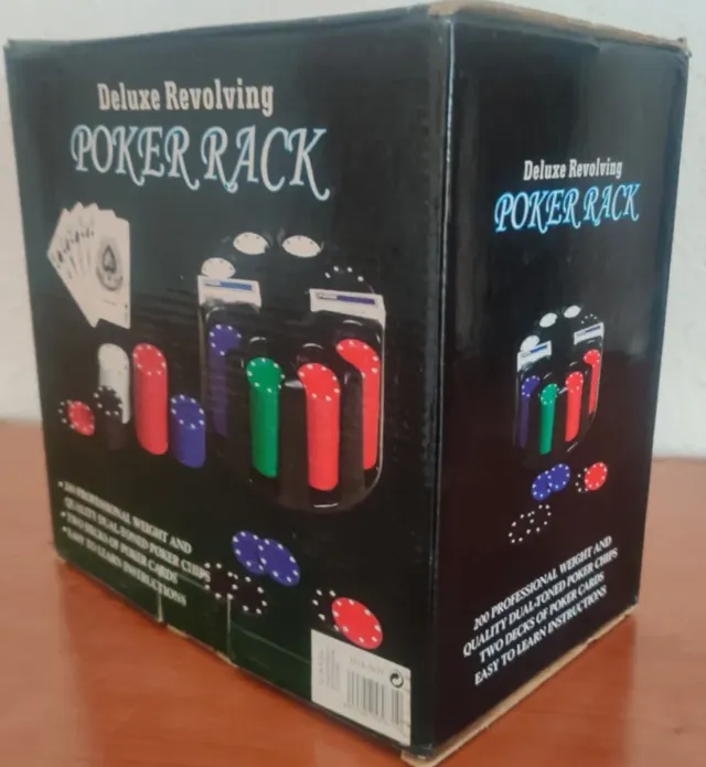 Set de póker Deluxe con fichas y cartas. - 200 fichas de póker de doble cara. - Dos mazos de cartas de póker.