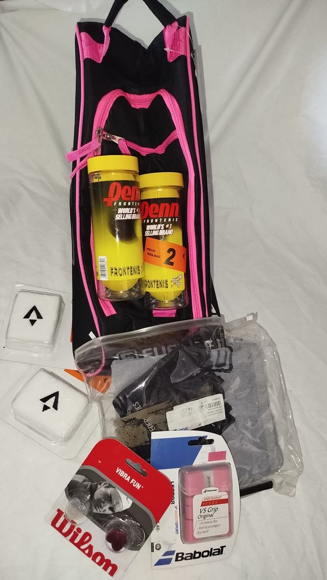 Set de tenis, mochila, 2 pack de 3 pelotas cada pack, 2 muñequeras,toalla y guantes, antivibrador de raquetas y Overgrips. Nuevo. Liquidación de tienda.
