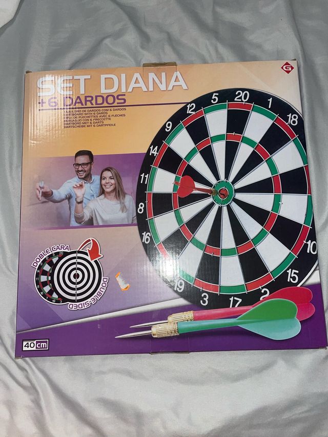 Set de diana con 6 dardos, ideal para entretenimiento. - Diana de doble cara. - Incluye 6 dardos. - Medida de la diana: 40 cm.