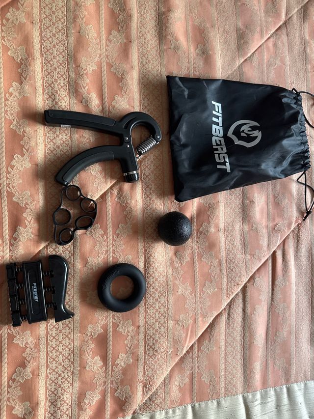 Kit completo para fortalecer antebrazos y manos. - Fortalecedor de agarre ajustable. - Anillo de resistencia. - Pelota de masaje. - Ejercitador de dedos. - Bolsa de transporte.