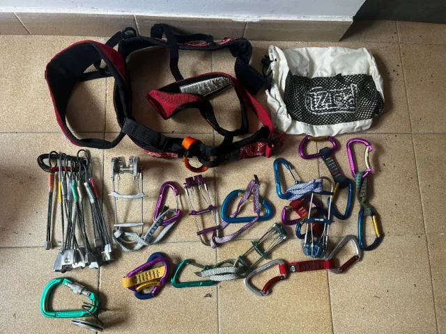 Conjunto de material de escalada de la marca Petzl. - Incluye arnés. - Mosquetones de varios colores. - Friends y fisureros.