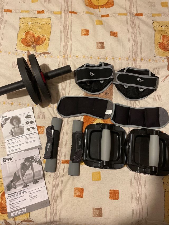 INCLUYE: Mancuernas 1KG cada una Set de pesas para brazos y piernas: 0,5kg cada una. Asas para hacer flexiones. Rueda abdominal Todo a estrenar, está NUEVO.