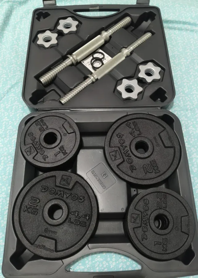 Detalles del productoSet de mancuernas ajustables con maletín para guardarlas y transportarlas fácilmente. Incluye barras, discos y cierres.