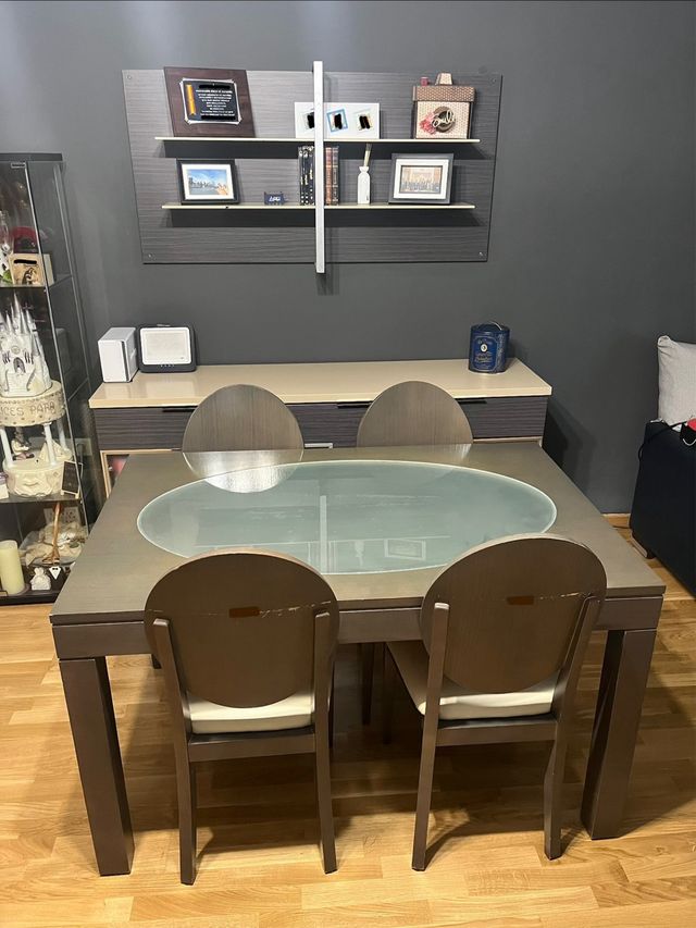 - Mesa de madera extensible con centro óvalo de cristal y cuatro sillas (250€)