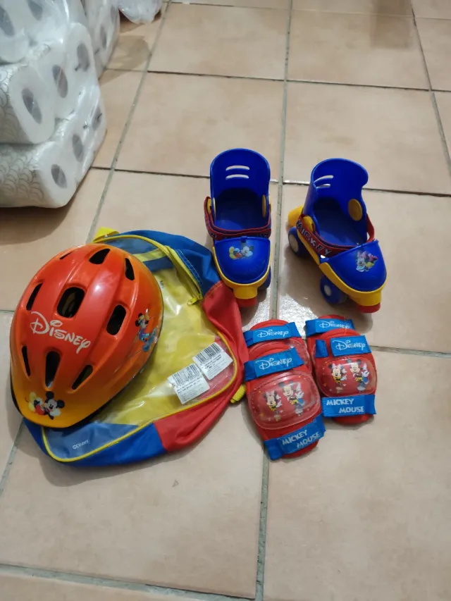 Detalles del productoSet de patines, protección y casco infantiles con diseño de Mickey Mouse. Talla de los patines del 27 al 30 ya q se abren para adaptarse.
