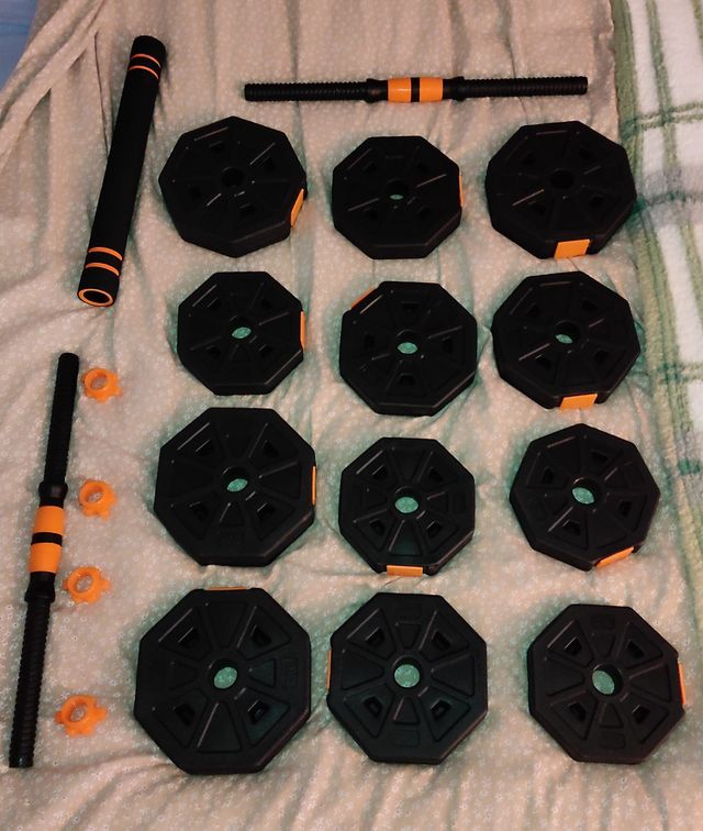 Complete home workout set. Includes: 2 dumbbells, 1 connector bar, 4×2 kg plates, 4×1.5 kg plates and 4×1.25 kg plates. Adjustable Vupplies workout bench included. Used but in good condition. Pickup only in Gandía. Total price: 20 €.