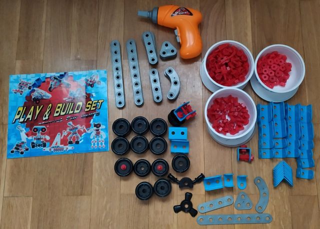 Detalles del productoConjunto de piezas de construcción de PLÁSTICO con tornillos y tuercas. Incluye taladro de juguete a pilas. Manual de instrucciones con diferentes modelos de ejemplo: robot, grúa, moto, avión, barco, etc. Sin caja.