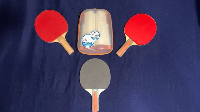 Conjunto de ping pong con tres palas, junto con una funda para guardarlas.