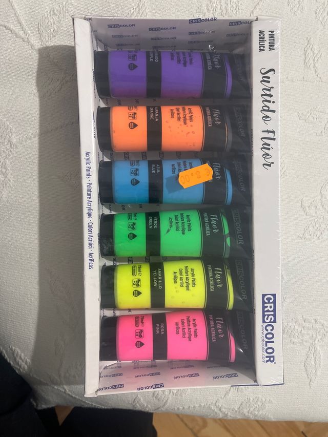Detalles del productoSet de pinturas acrílicas Criscolor en tonos flúor.