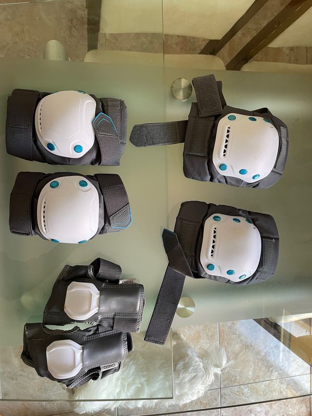 Detalles del productoSet de protecciones deportivas marca Oxelo, ideal para patinaje o ciclismo.