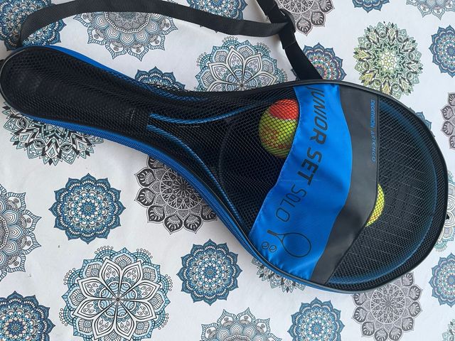 Detalles del productoJuego de raqueta y pelotas para jóvenes. Ideal para principiantes. Incluye una raqueta de tamaño junior y dos pelotas de tenis de color naranja y amarillo. La raqueta se encuentra en perfecto estado y las pelotas están nuevas. - Raqueta de tamaño junior. - 2 pelotas de tenis. - Bolsa de transporte incluida.