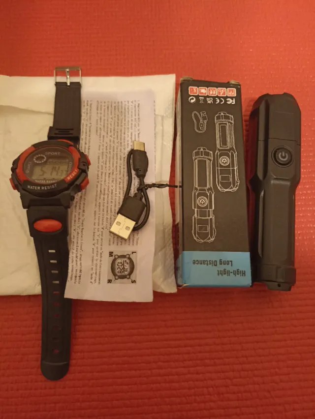 Este set incluye un reloj deportivo y una mini linterna.