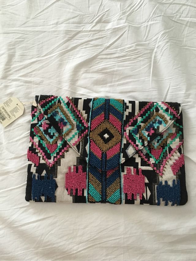 BOLSO SFERA tipo sobre, plano, de mano y de colgar con cadenita, multicolor con abalorios bordados tipo etnico Nuevo!!