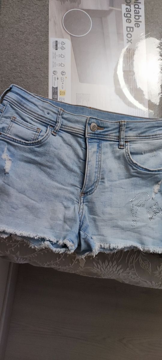 Shorts vaqueros . Son de color azul claro desgastado y tienen detalles deshilachados en el bajo. Además, presentan un diseño con brillantes en la parte delantera.