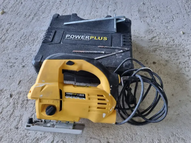 Detalles del productoSierra caladora Powerplus X036 en color amarillo y negro. Incluye su maletín de transporte y varias hojas de sierra.