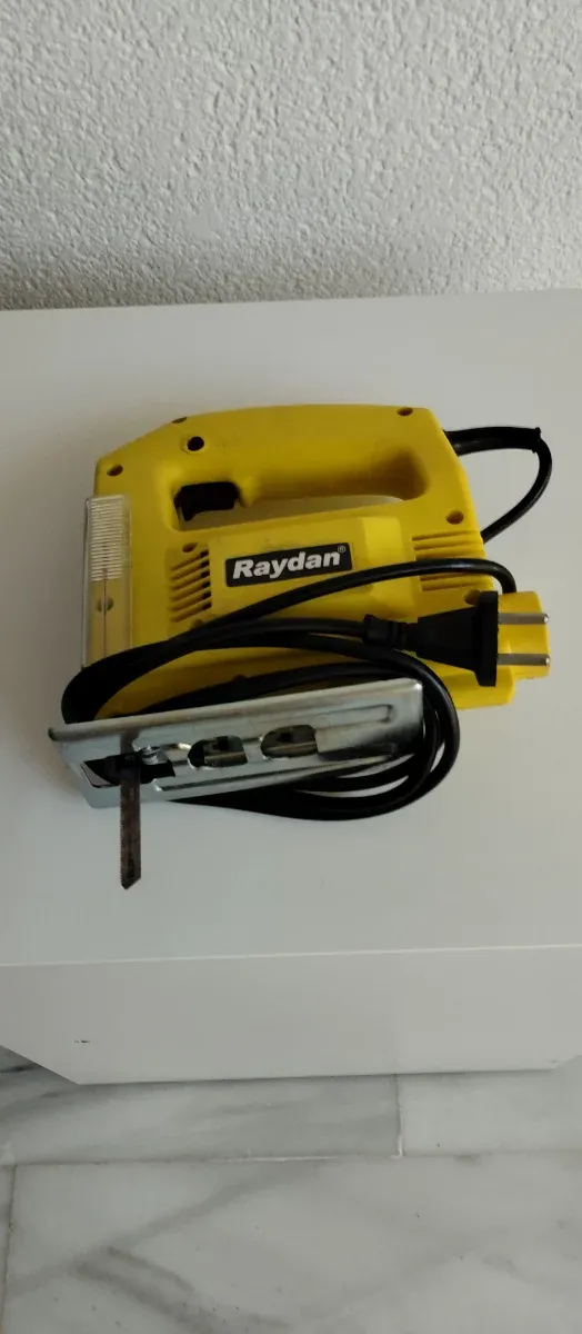 Detalles del productoSierra caladora de la marca Raydan en color amarillo. Herramienta eléctrica para cortes.
