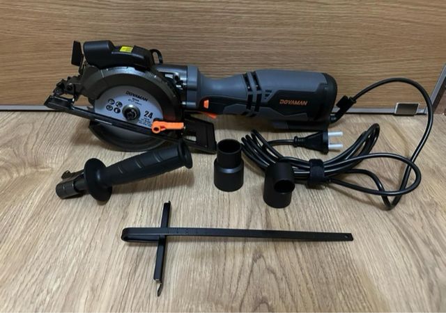 Sierra circular de mano DOVAMAN con motor de 710W. Incluye accesorios para su uso. - Mango auxiliar. - Adaptadores para aspiración de polvo. - Guía de corte.