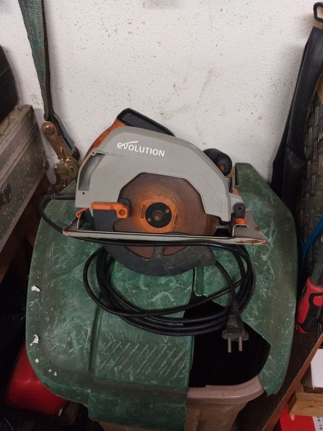 Sierra circular Evolution de 1200w con protección de disco. Incluye llave de apriete y tiene regulador de angulo