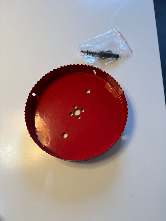 Detalles del productoSierra corona de color rojo, ideal para usar con caladora. Incluye accesorios.