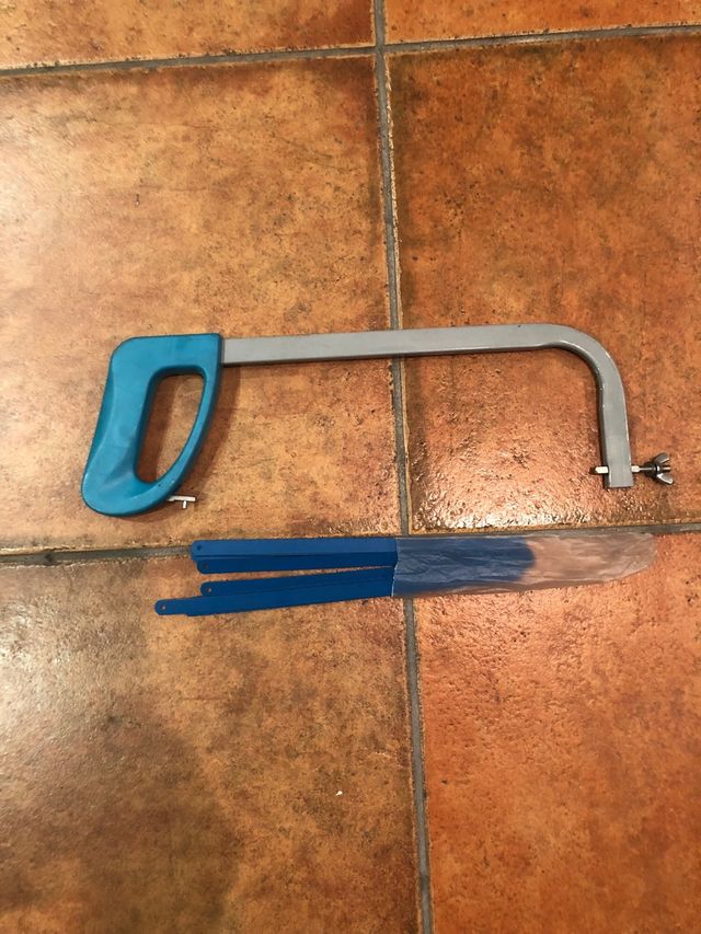 Detalles del productoSierra de arco con mango azul y marco gris. Incluye un paquete de hojas de sierra de repuesto.