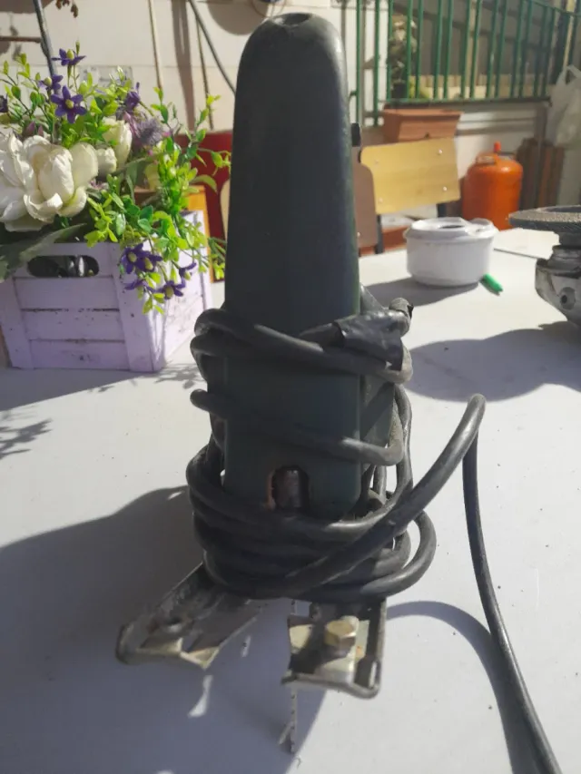 Herramienta eléctrica para cortes. - Cable de alimentación enrollado. - Base metálica con tornillos.